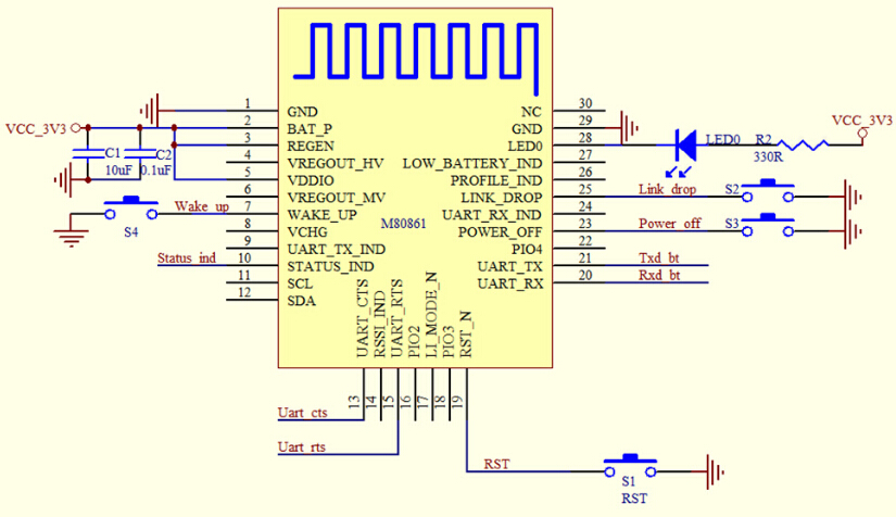 | 10 | O | STATUS_IND | Bluetooth connection status indicator: High level - Bluetooth not connected Low level Bluetooth connection (including EDR and BLE). |