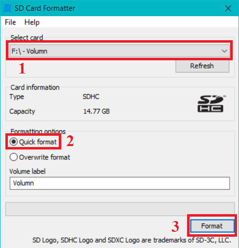 - Bước 1: Format thẻ nhớ bằng phần mềm SDCardFormatter.