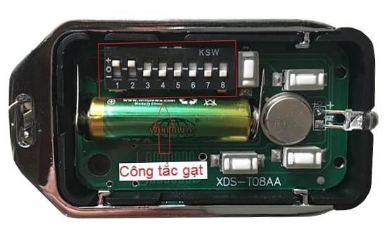 - Sau khi tháo bạn sẽ nhìn thấy bo mạch bên trong của điều khiển có 1 dãy gồm 8 công tắc gạt tương ứng với 8 bit mã hóa của điều khiển.
