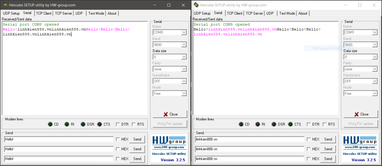 Bước 5: Chọn các thông số trong mục Serial như trong hình rồi bấm “Open”. Trong mục Send nhập nội dung cần gửi rồi bấm “Send” và xem kết quả.