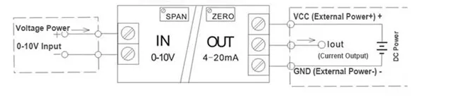 4: Điện áp được thay đổi trong khoảng 0-10V và dòng điện đầu ra thay đổi tuyến tính trong vòng 4-20mA.
