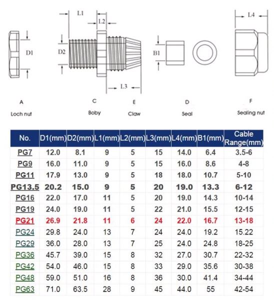 Quy cách hệ ren: PG 9 dùng vặn vào phi lổ Ø16 (Đường kính cáp siết: 4-8mm)